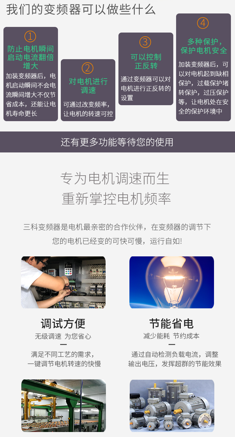 ⊙提供多種故障保護(hù)功能:過流、過壓、欠壓、過溫、缺相、過載等保護(hù)功能