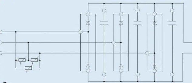 1.整流器/變流器:VFD主電源電路的三個主要部分之一,是功率流的第一部分。輸入交流線電壓在轉換器部分被整流為DC電壓,轉換器部分由二極管、可控硅整流器(S . C . R)或絕緣柵雙極晶體管(IGBT)以全波橋式結構連接而成。