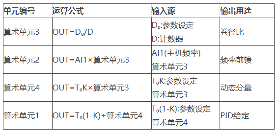 [卷徑參數(shù)] P100 = 2000 ; 計數(shù)器預(yù)置值 P101 = 20000 ; 計數(shù)器最大值 P102 = 10.0 ; 初始卷徑百分比D?(%) [張力參數(shù)]P201 = 30.0 ; 錐度系數(shù)K(%)P200 = 80.0 ; 初始張力T?(%)[PID參數(shù)]P300 = 3.5 ; 比例增益