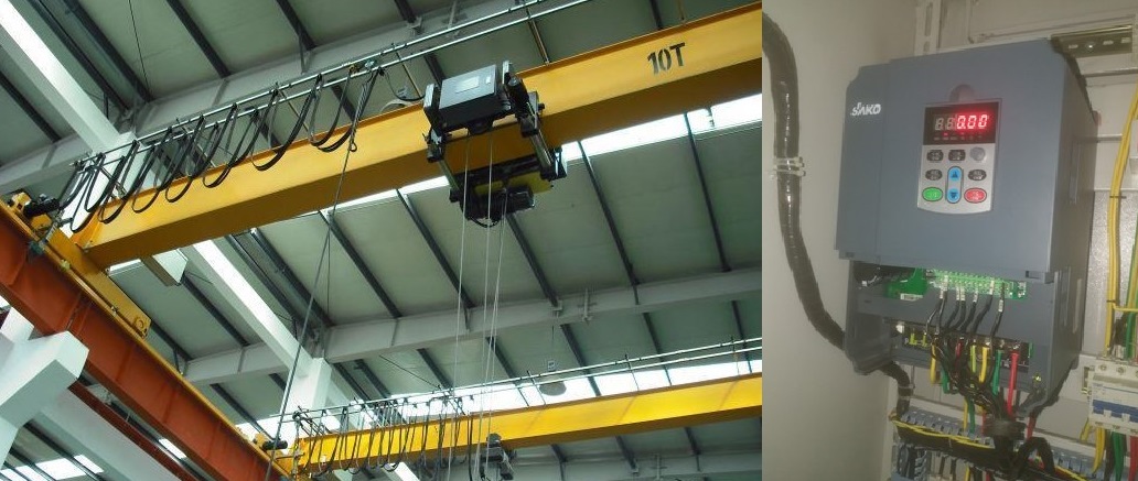 當(dāng)我們需要的對(duì)兩臺(tái)或兩臺(tái)以上生產(chǎn)機(jī)械的電機(jī)進(jìn)行同時(shí)拖動(dòng)時(shí),這里我們以橋式起重機(jī)為例,該設(shè)備是由安裝在兩側(cè)相同功率的電機(jī)進(jìn)行同時(shí)拖動(dòng)。這里的兩臺(tái)電機(jī)是通過(guò)同一臺(tái)起重機(jī)變頻器進(jìn)行供能與控制的,協(xié)調(diào)兩臺(tái)電機(jī)進(jìn)行升降調(diào)速的功能。這種情況不但要求兩臺(tái)電機(jī)的轉(zhuǎn)速同步,而且要求它們的負(fù)荷分配盡量均衡。而杭州三科生產(chǎn)SKI600系列產(chǎn)品所具備的下垂功能,可以很好地滿足起重設(shè)備這種應(yīng)用需求。