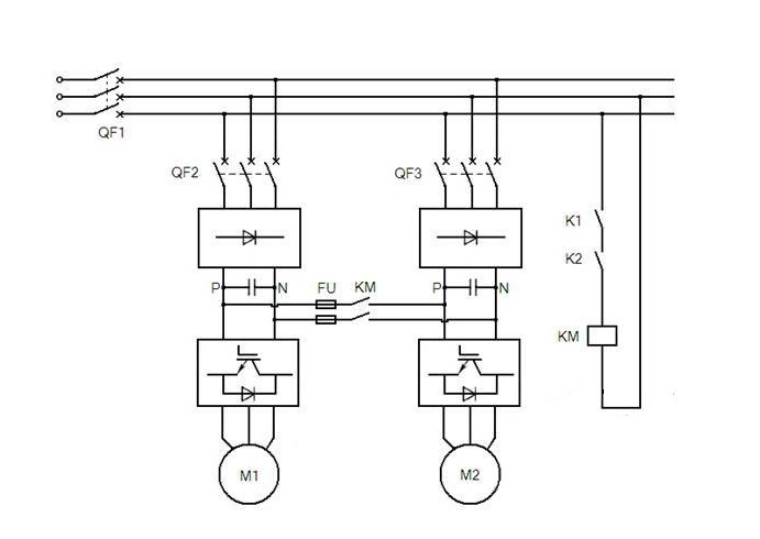 3.在有些場合,根據(jù)工藝特點使用VFD共用母線的方案,這種方案及解決了VFD過壓的問題,同時,將工作過程中產(chǎn)生的能量回饋到直流母線再利用,節(jié)約能源。