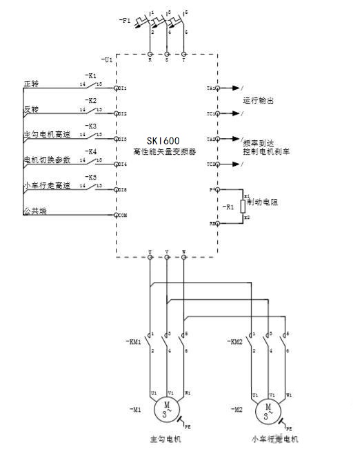 1.現(xiàn)場使用一臺三科生產(chǎn)的SKI600系列產(chǎn)品,用于控制兩臺電機(jī)