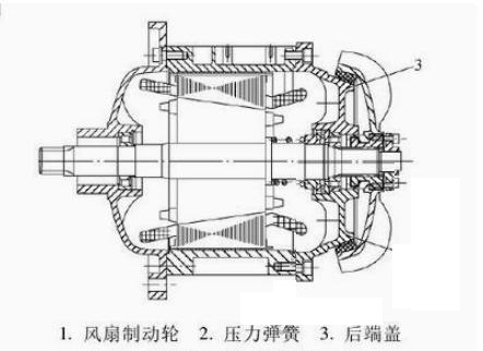 錐形轉(zhuǎn)子電動機(jī)定子內(nèi)腔和轉(zhuǎn)子外形都成錐形,其錐形制動環(huán)鑲嵌于風(fēng)扇制動輪上,靜制動環(huán)鑲在后端蓋上,定子通電后,產(chǎn)生旋轉(zhuǎn)磁場,同時產(chǎn)生軸向磁拉力,使轉(zhuǎn)子軸向移動并壓縮彈簧,使風(fēng)扇制動輪上的錐形環(huán)與靜制動環(huán)離開,轉(zhuǎn)子開始轉(zhuǎn)動,定子斷電后,軸向磁拉力消失,轉(zhuǎn)子在彈簧的作用下,連同風(fēng)扇制動輪一起復(fù)位,使動靜制動環(huán)接觸,產(chǎn)生摩擦力矩,迫使電動機(jī)立即停轉(zhuǎn)。