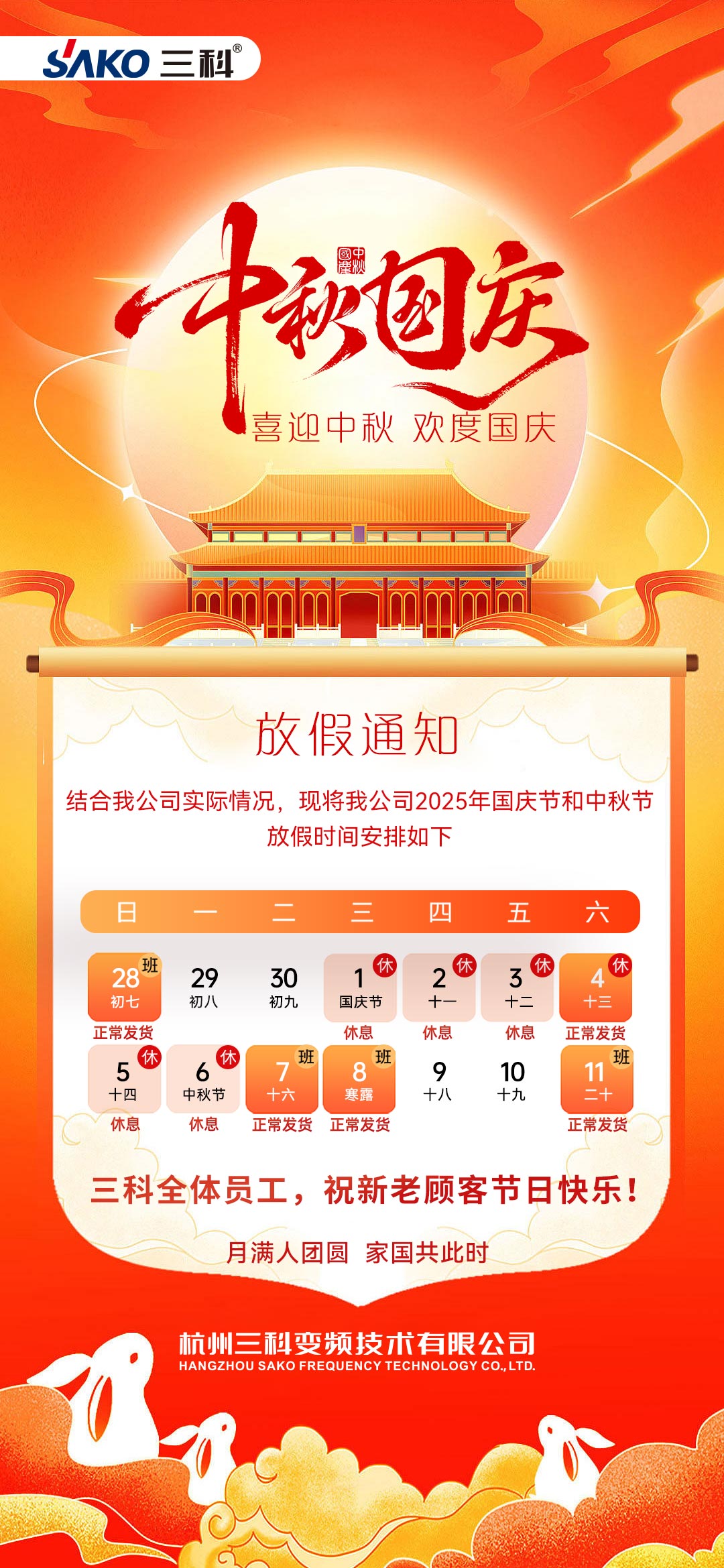 根據(jù)國(guó)家法定節(jié)假日安排,結(jié)合公司實(shí)際運(yùn)營(yíng)情況,杭州三科變頻技術(shù)有限公司2025年中秋、國(guó)慶節(jié)放假安排如下: