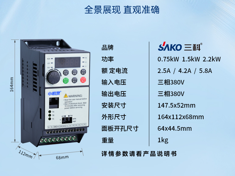 安裝需由電氣專業(yè)人員操作,接地電阻小于 0.1Ω,電機(jī)電纜超 50m 建議加裝輸出電抗器,說明書詳細(xì)標(biāo)注端子功能與尺寸(部分型號 68mm×164mm×112mm,凈重 0.75kg),方便部署。