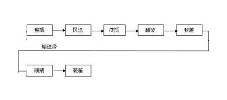 生產(chǎn)線共使用17臺變頻調(diào)速器,每小時(shí)產(chǎn)量15000瓶,分別用于風(fēng)力輸送、傳送帶輸送、洗瓶、裝罐、壓蓋。流程圖各部分的主要功能和工藝流程如下: